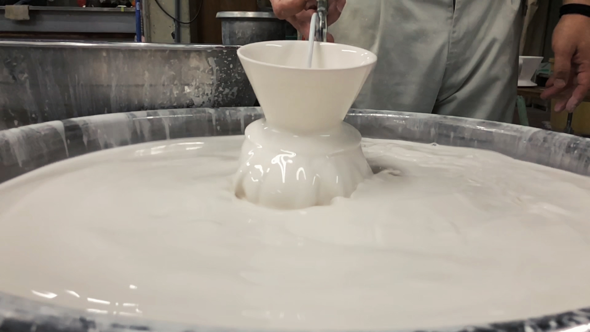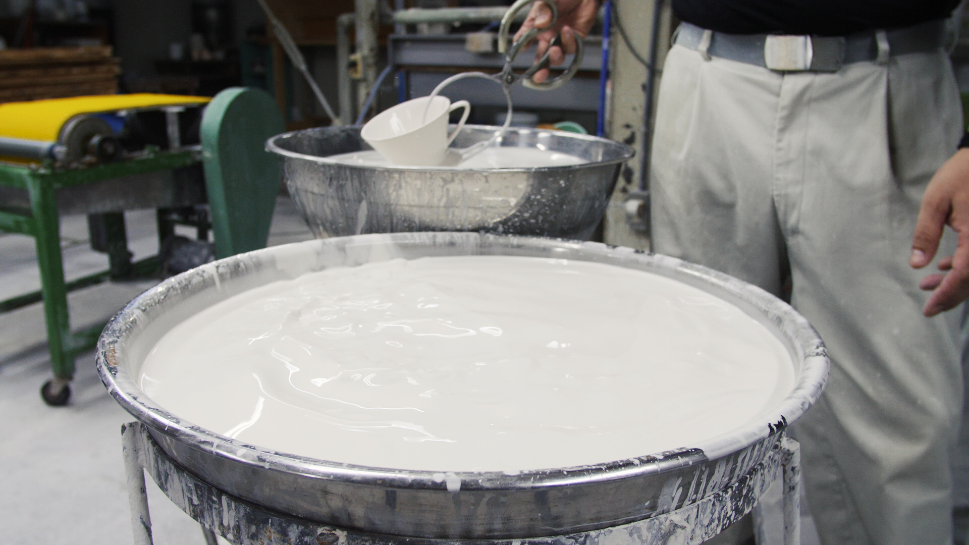 工房の奥ではボウルに白い液体をためて、素焼きされたドリッパーを、この液体にくぐらせる作業が行われていました。