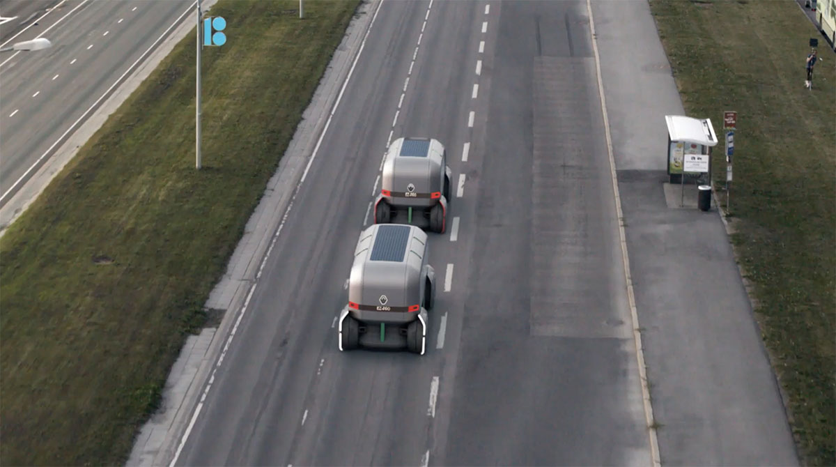 「EZ-PRO」は、最新のコネクテッド技術を搭載した自動運転EVで、隊列を組んで走行しルートに応じて分離することでスムーズにラストワンマイルの配達を行ってくれる・