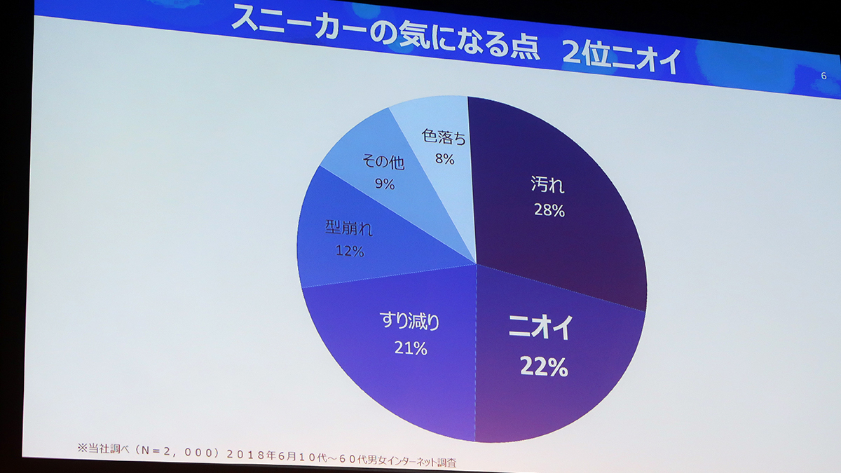 イヤなニオイ発するのは、足にかいた汗の湿気と雑菌によってニオイ物質「イソ吉草酸」が発生するのが要因の1つに上げられる。靴脱臭機「MS-DS100」では、微粒子イオン「ナノイー」より約10倍の「OHラジカル」を生成する「ナノイーX」によって脱臭効果が期待できるという。