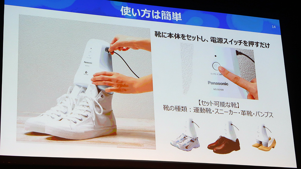 パナソニックが発表した靴脱臭機「MS-DS100」は、毎日の「ニオイケア」を気軽に行えるツール。一日はいた靴のイヤなニオイを靴に差し込んで脱臭する。