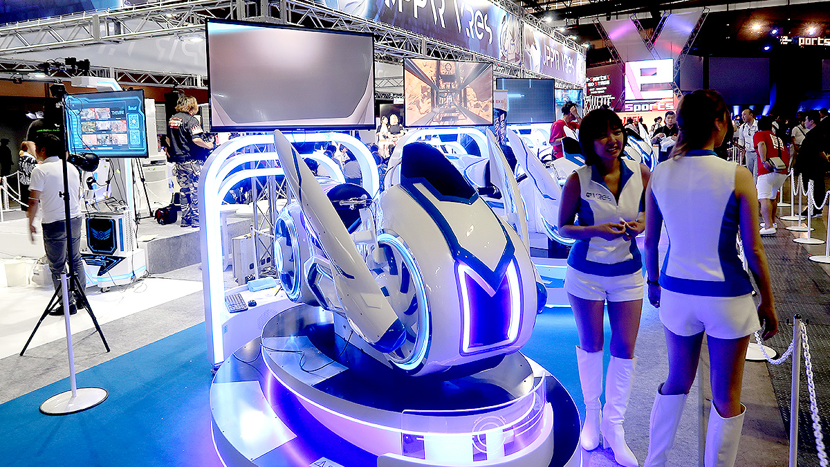 また、アミューズメント機器など展開するJPPVRは、VRゴーグルを装着して遊ぶ自転車型のVR筐体や、ガトリング砲を撃ちまくるVR筐体などユニークな試遊機で楽しめる。