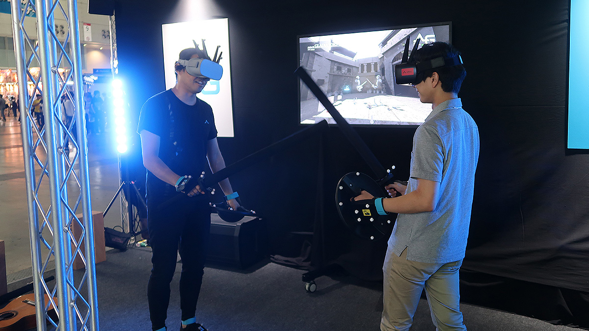 VR関連は別棟でさまざまな展示が行われていた。単にVRゲームを紹介しているだけでなく、体を動かすものが多いのが特徴。空間を移動できるVRシステムを紹介していたABALのブースでは、担当者が「バーチャルの行き着く先はアナログだ」などと話していた。