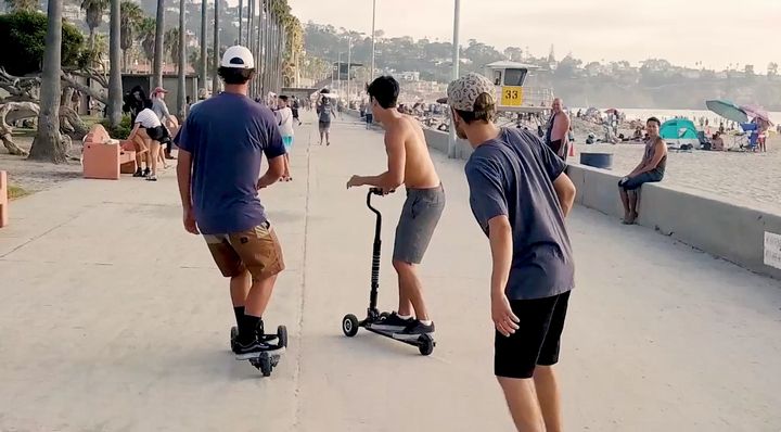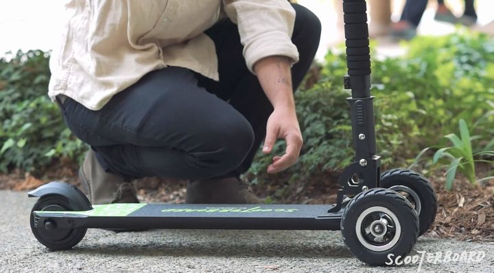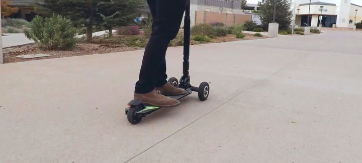 InMotion USA社が開発した、キックボードとスケートボードが合体したようなデザインの「Scooterboard」。前輪車軸が独自のものになっており、類似のボードよりもデッキを大きく傾けられるユニークなライディングを楽しめる。