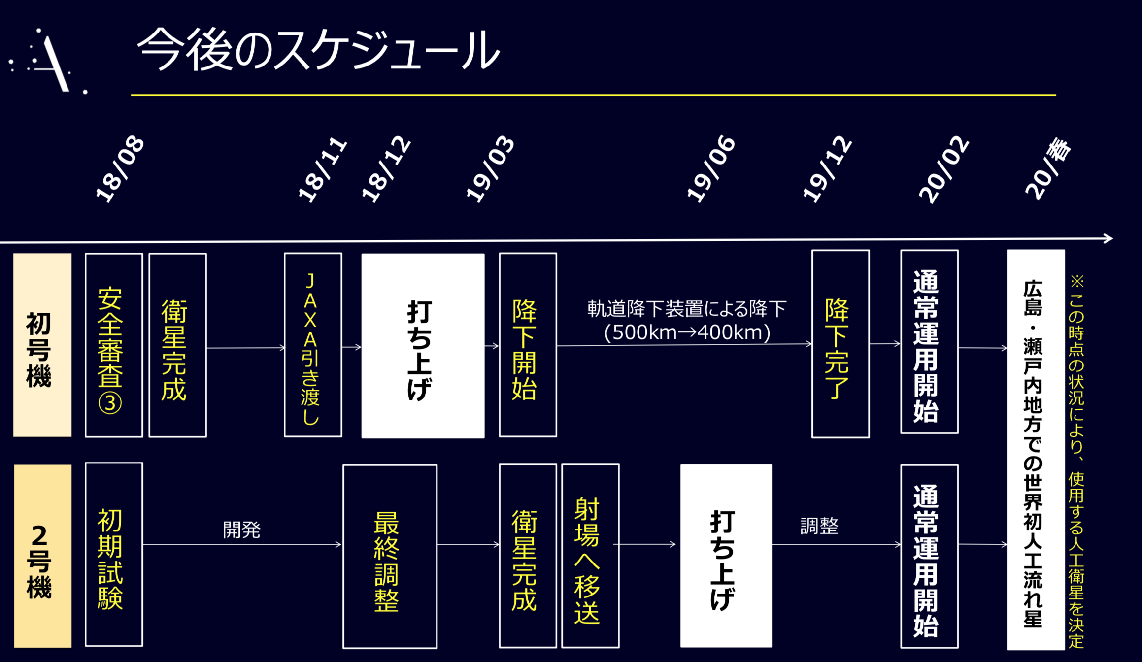 2020年に流れ星を降らせる衛星のうち1機は今年の10、11月頃にJAXAの安全審査を経て完成する予定。