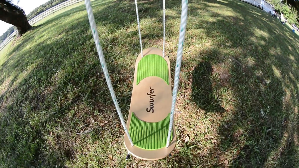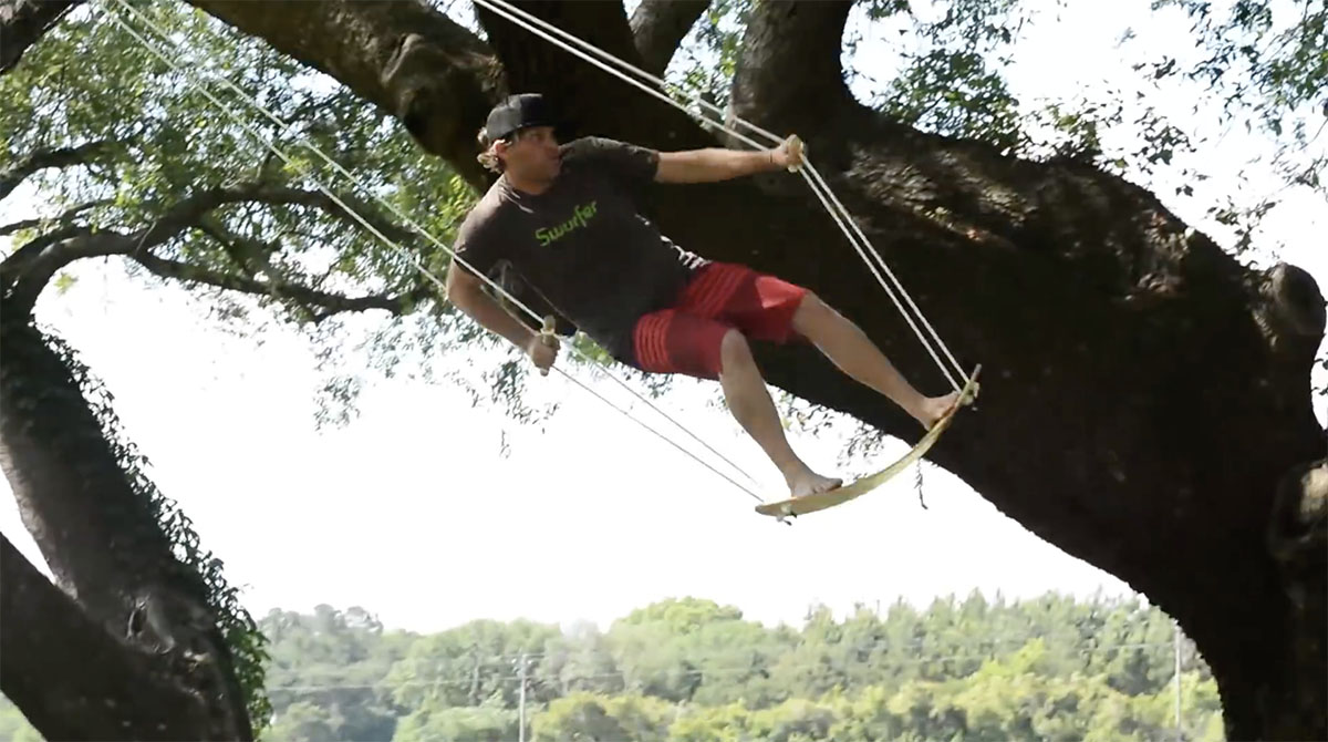 湾曲した木製ボードを木に吊るすだけで準備OKの「Swurfer」。