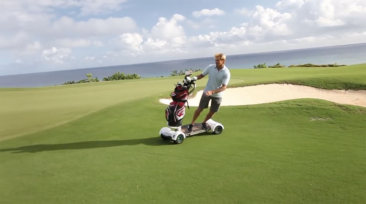 アメリカの企業が開発した、スケボーのような乗り心地の電動ゴルフカート「GolfBoard」。手軽に誰でも乗りこなすことができ、ゴルフバッグと一緒に快適に移動できる乗り物だ。