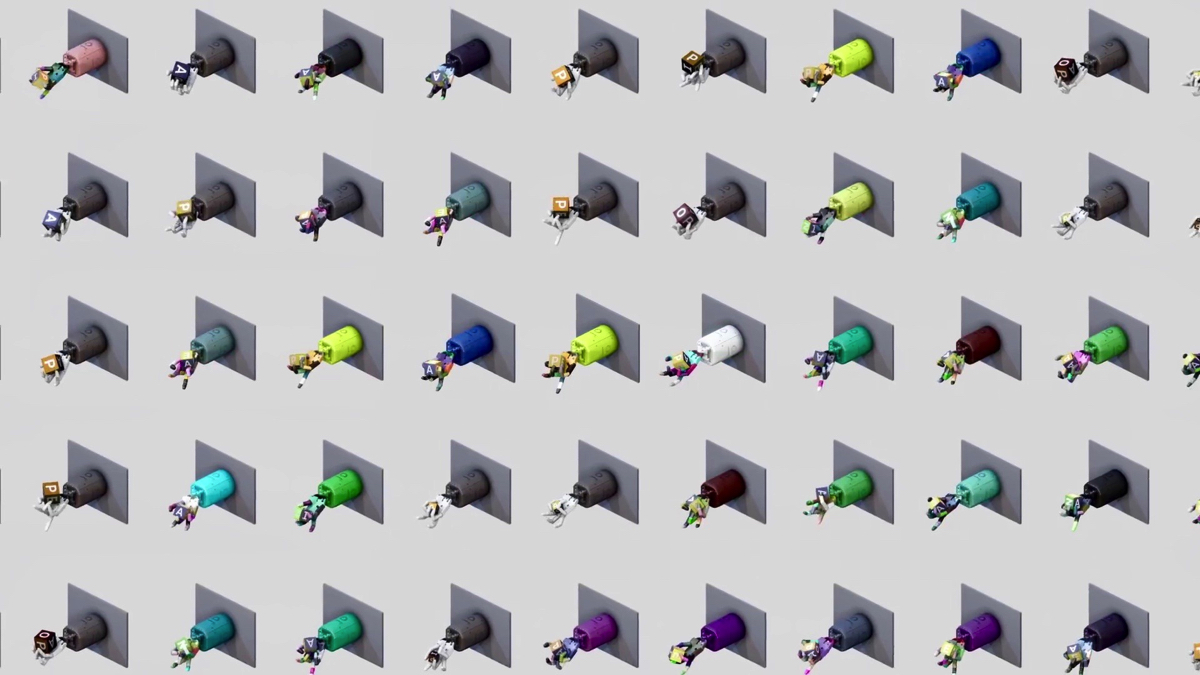 物理エンジンのロボットシミュレーター「MuJoCo」内で、立方体の重さや摩擦係数などの条件をランダムに設定されながら、仮想のロボットアームが強化学習を実行。