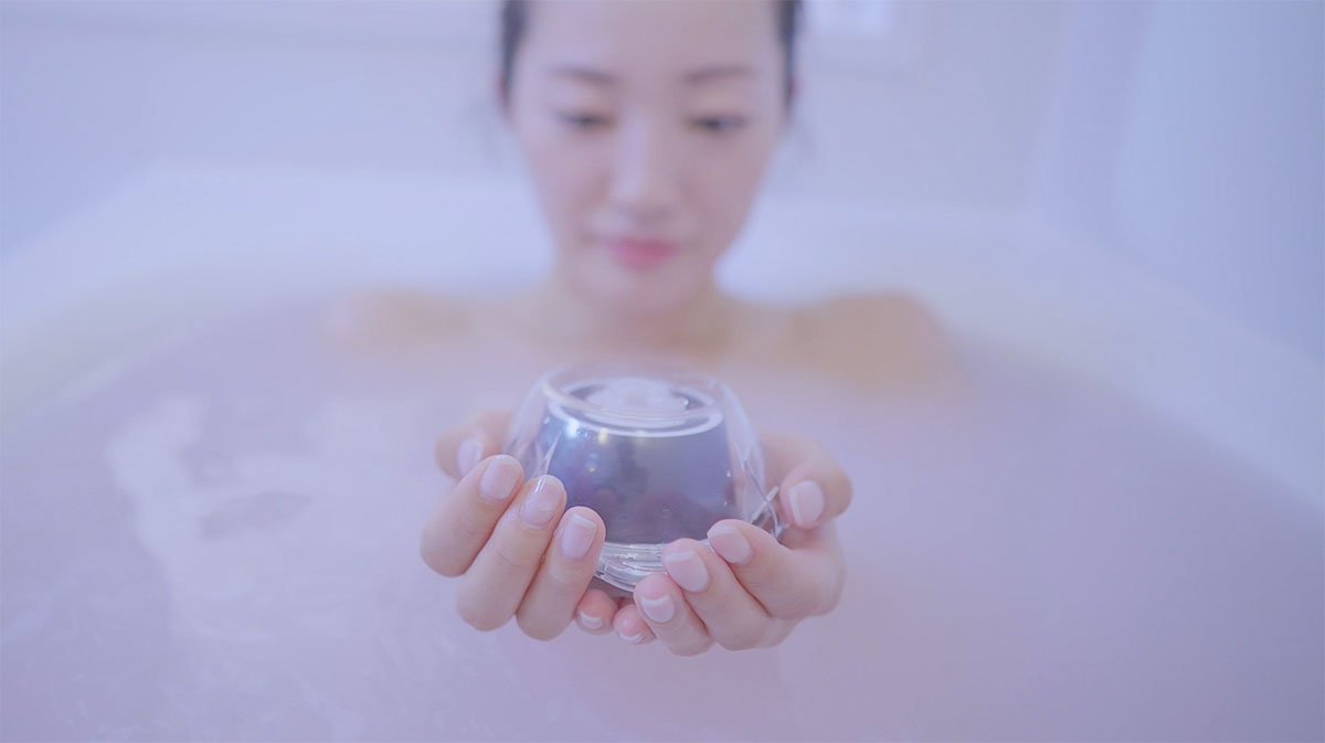 使い方は超簡単で、本体を「bathCAPSULE」の中に入れ、浴槽に沈めるだけ。音波の減衰が低くエネルギーを効率的伝えることができる水中ならではの心地よい響きを、お風呂で思う存分楽しむことができる。