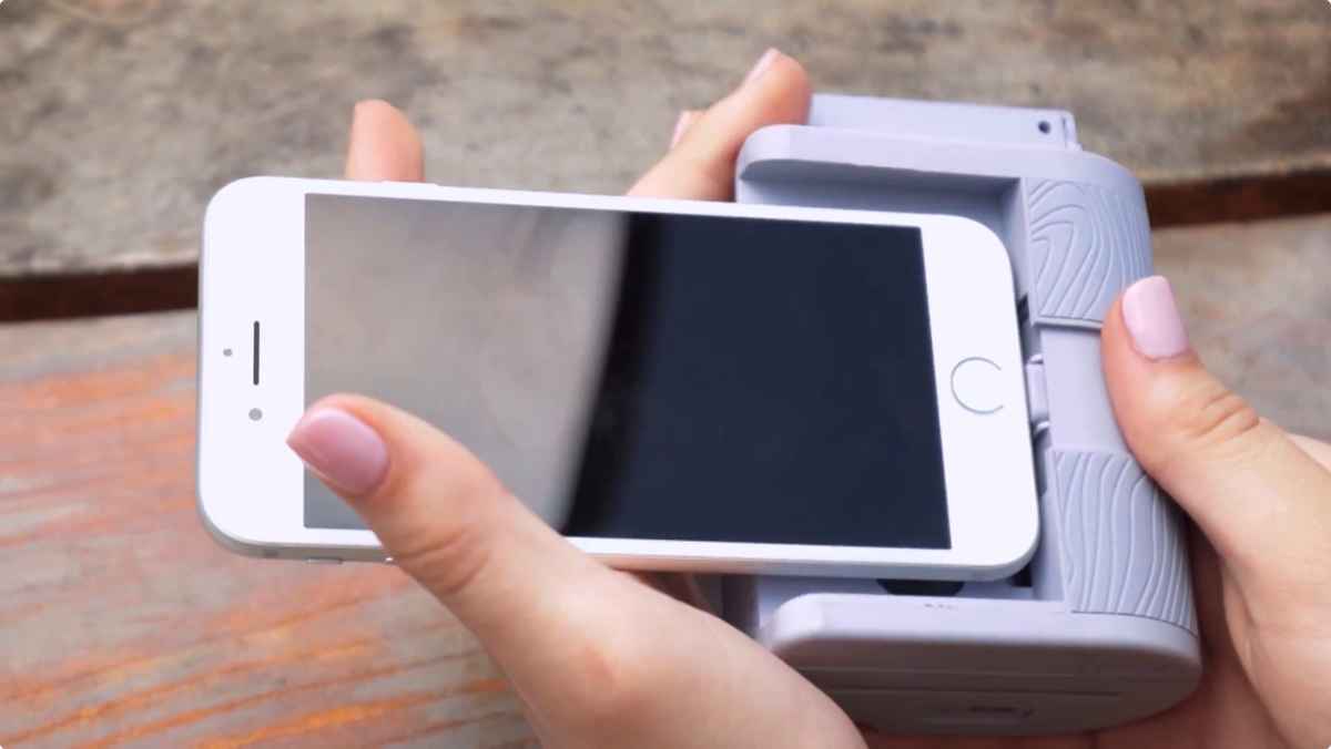 iPhoneのLightning端子にドッキングする「Prynt Pocket」。サイズは調整できるので、ケースの上からでも装着できるようだ。撮影した写真をその場でプリントアウトして、インスタントカメラのように思い出を形にすることが可能だ。