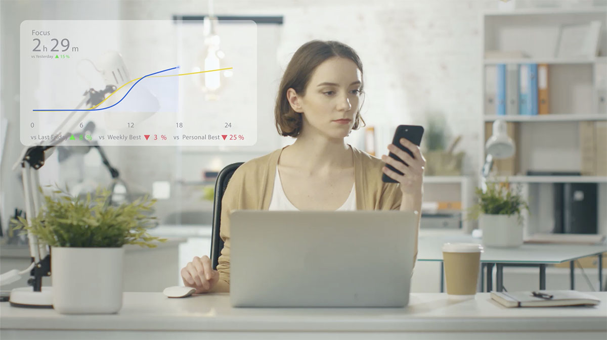 「FOCI」で計測したデータは専用アプリでリアルイムにビジュアル化して表示することができ、様々なシーンで集中状態を認識して改善に役立てることができる。AIにより過去のデータから目標設定なども可能で、パーソナルトレーナーのように活用することが可能だ。