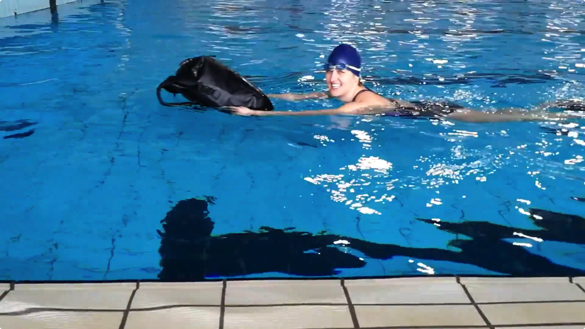 プールで浮き袋にできるほどの密閉性があるが、内部に耐水設計のPCケースも入るようになっている。気軽に開け閉めするのが面倒かもしれないが、バッグの表側にイージーアクセスポケットがあり、サイフなどの小物はすぐに取り出せるようだ。
