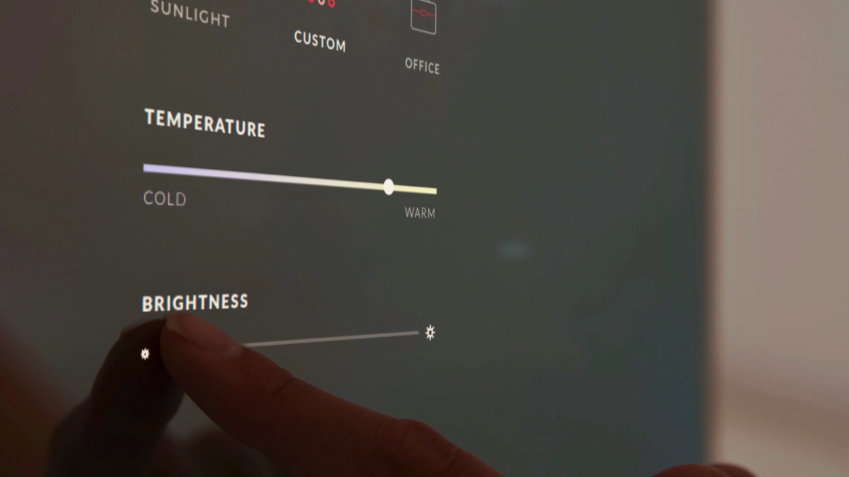 Amiroh Smart Mirrorを囲むように配置されたライトは、暖色・寒色を調整することができる。さらに、仕事用・晴れた日用など、プロのメイクアップアーティストが調整した様々なシーンごとの色温度をプリセットから選ぶことができる。