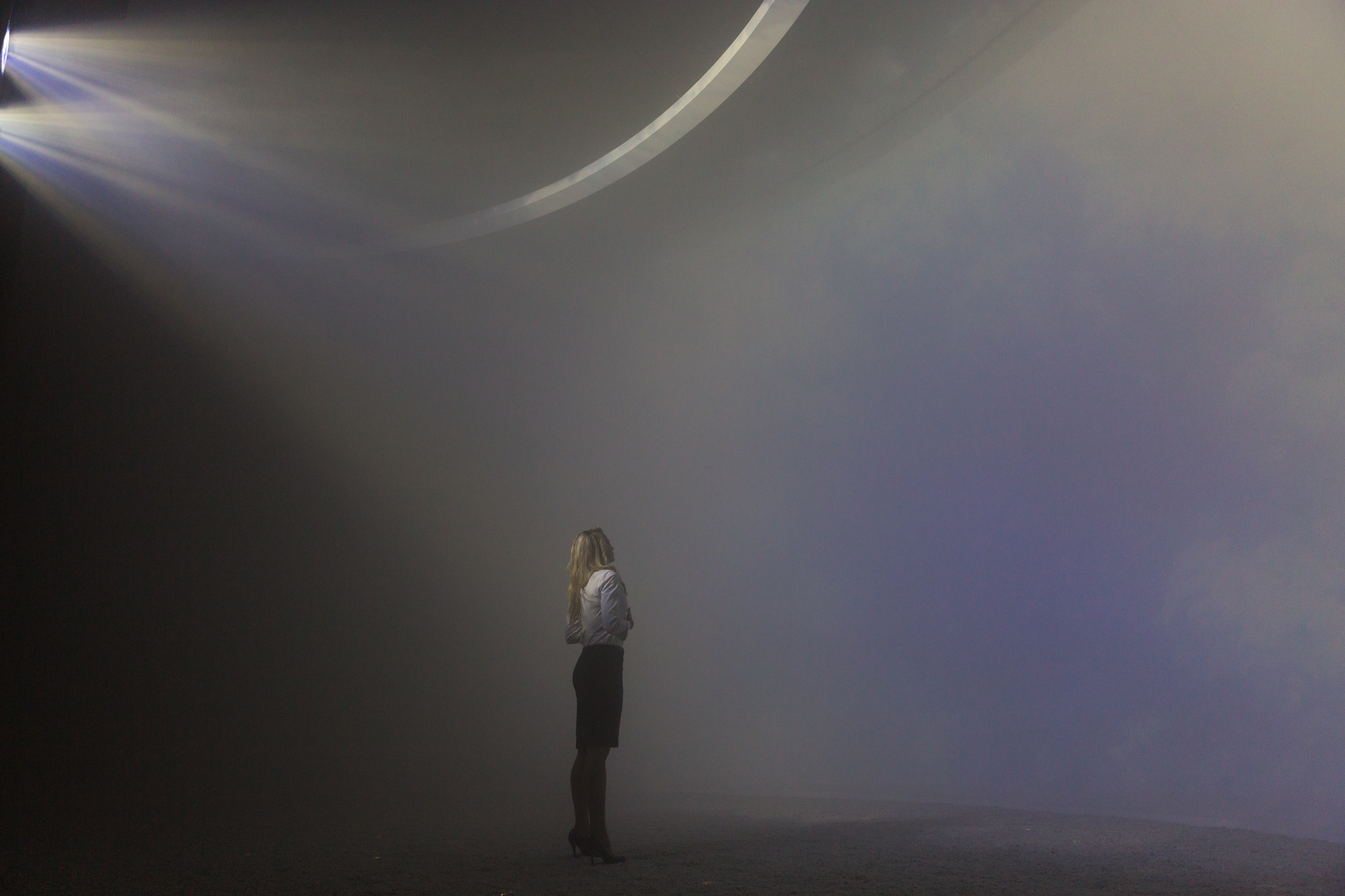 その内部は霧で満たされ、プロジェクターの光が霧に反射し投影される映像と相まって幻想的な空間を生み出す。