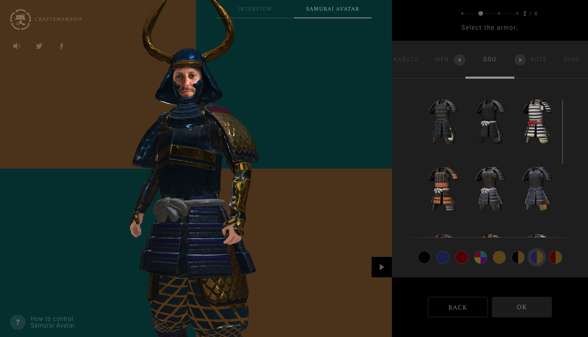 「SAMURAI AVATAR」のページでは、自分の顔写真をアップロードして、自分の甲冑姿の3Dモデルデータを作成することが可能。