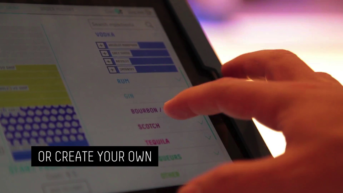 注文はアプリから。お気に入りのスピリッツ、ジュース、ソーダ、ワイン、ビール、ガーニッシュの中からレシピを指定でき、世界最先端のロボットアームが、ミリリットルの精度でカクテルを作ってくれる。制作状況はインフォグラフィックで視覚的に教えてくれるようだ。