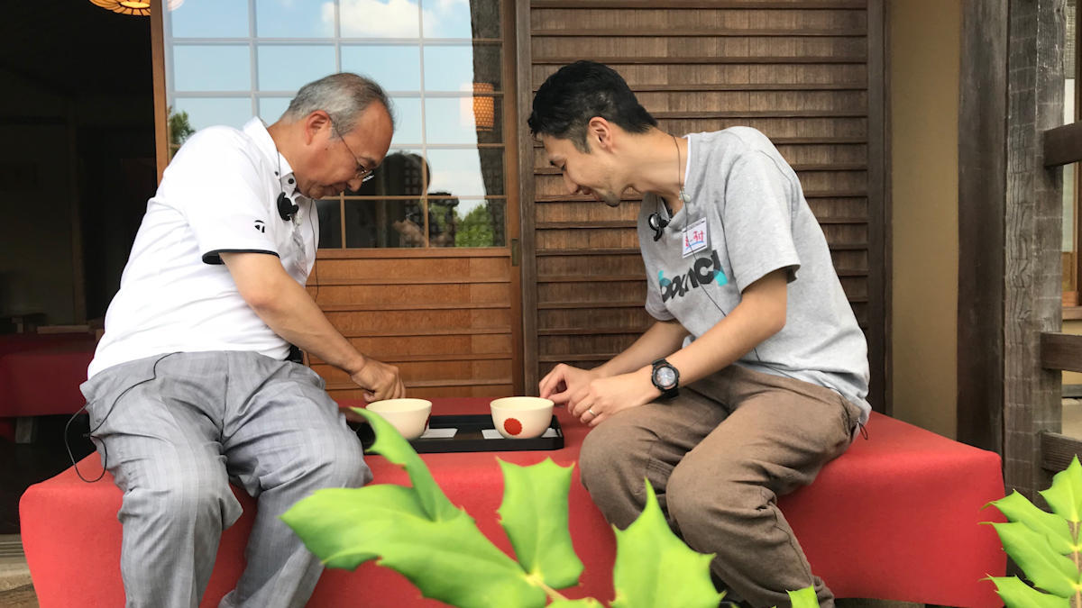 途中で日本庭園にあるお茶屋さんで一休み。日本庭園の美しさとお茶の粋な計らいに、父は写真を撮りまくり母に送ります。