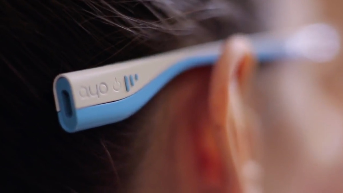 「AYO」は細身のメガネ型の本体に、LEDライトや周辺光センサーを搭載したウェアラブルデバイス。そして目の上部からブルーライトを照射することで、体内時計を正常化できる。