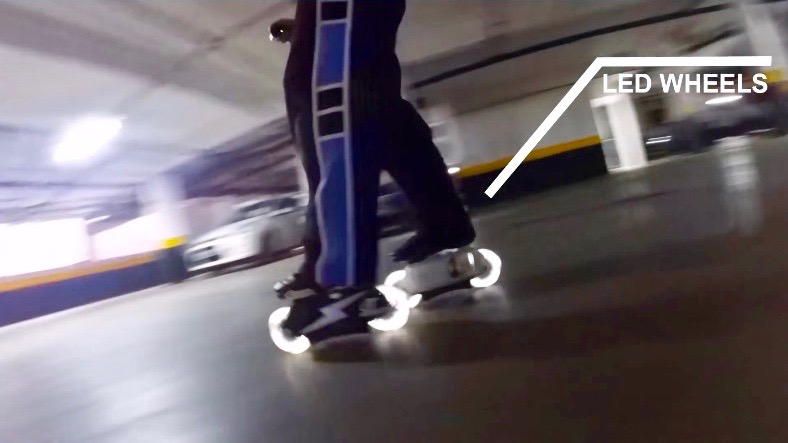 Thundrbladeは、すべての電子機器、バッテリー、モーターをフレームに納めた「フレームシステム」を採用しているので、自分のお気に入りのスケートブーツを電動化させることができる。ホイールにはLEDを搭載しているので、夜の街を駆け抜ける時も安心だ。