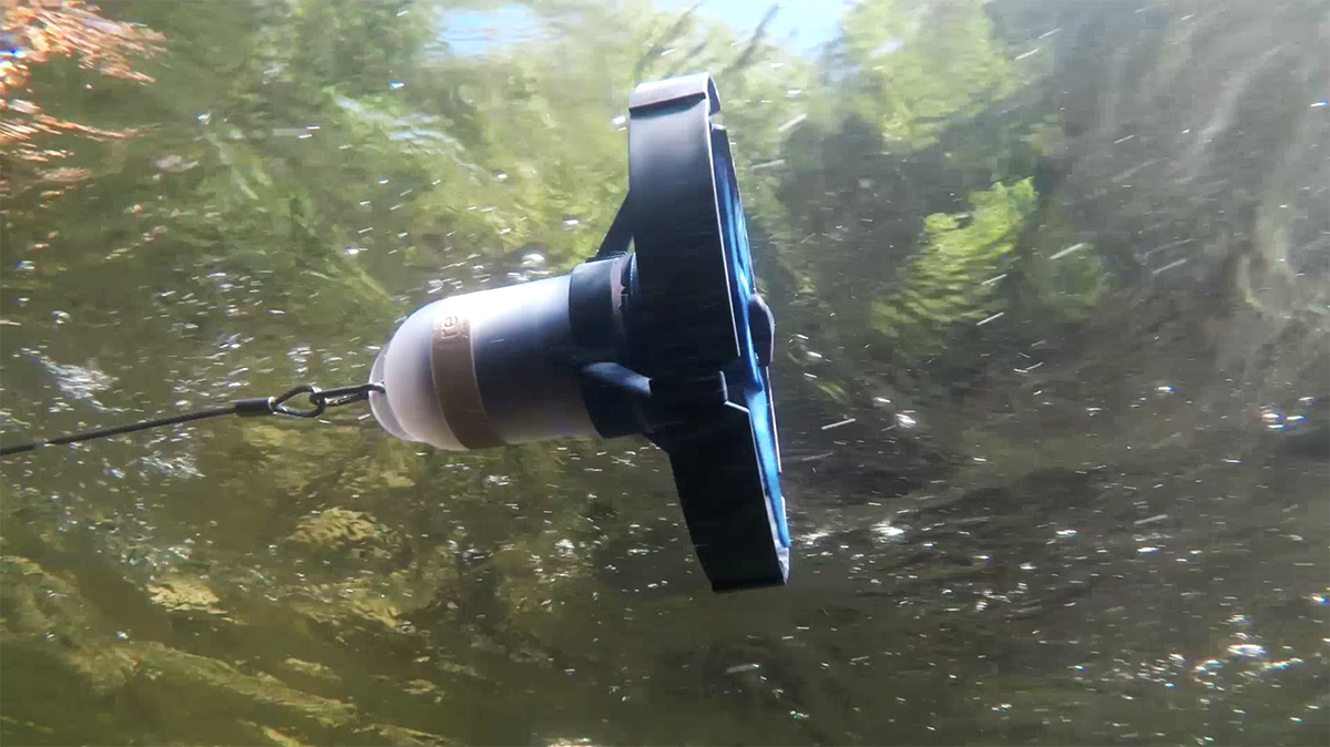 羽根を開いて川などに投入するだけで、水力でタービンを回して発電した電力を本体のバッテリーに充電可能だ。