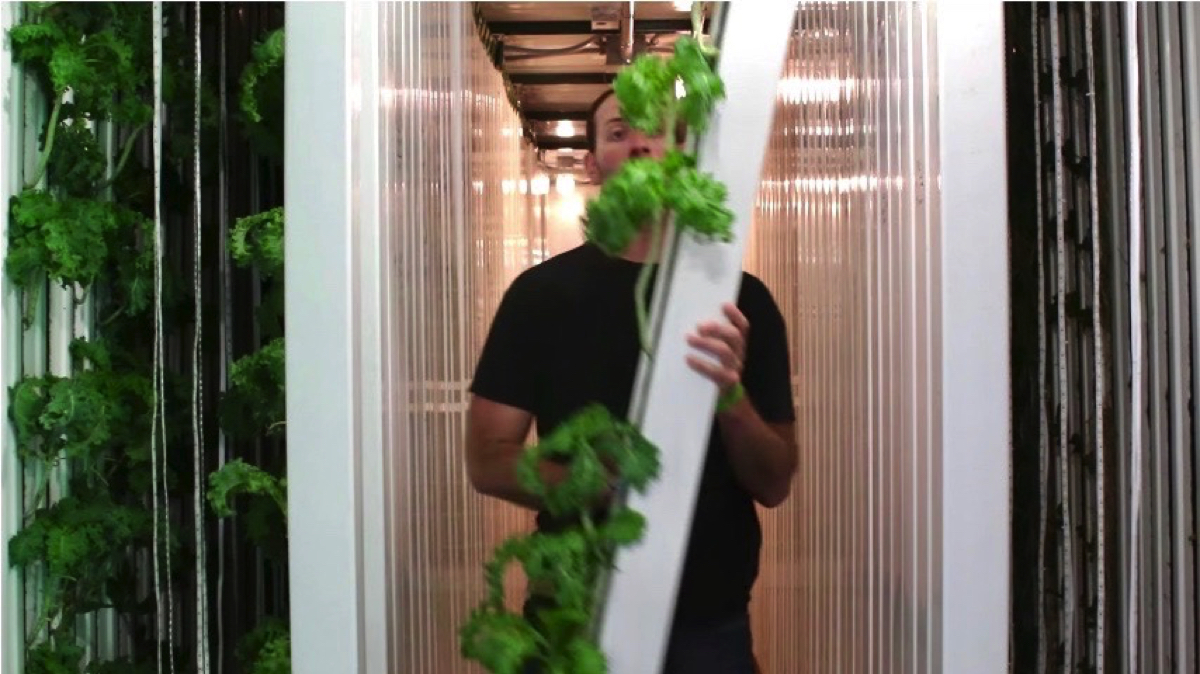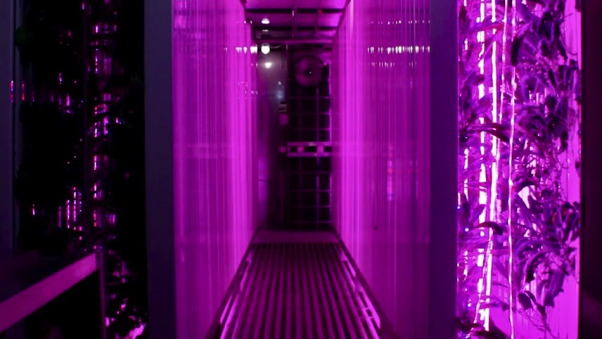 日光の役割をコンテナの天井から吊るされたライトが担い、天候や土壌に左右されることなく年間で、農地約0.7ヘクタール分を収穫できる。使用する水の量は約90%も節水できるようだ。