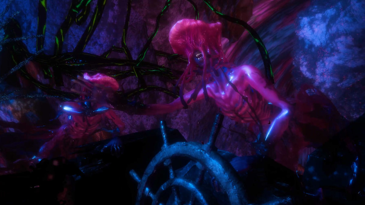 舵を操舵すると、舵が動き、見える景色も変わります。また、亡霊を追い払おうと手を動かすと、その動きに合わせて亡霊たちも去っていきます。