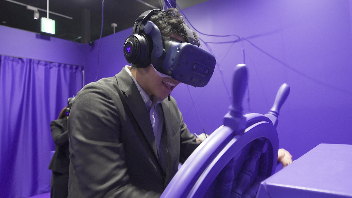 でもこの部屋の光景が、ヘッドマウントディスプレイを装着すると一変。いつのまにか私たちは、大海原をゆっくりと進む船の上にいます。見渡すと夜空が広がり、幻想的な雰囲気です。船の舵もいつのまにか、本物のような質感に変わっていました。