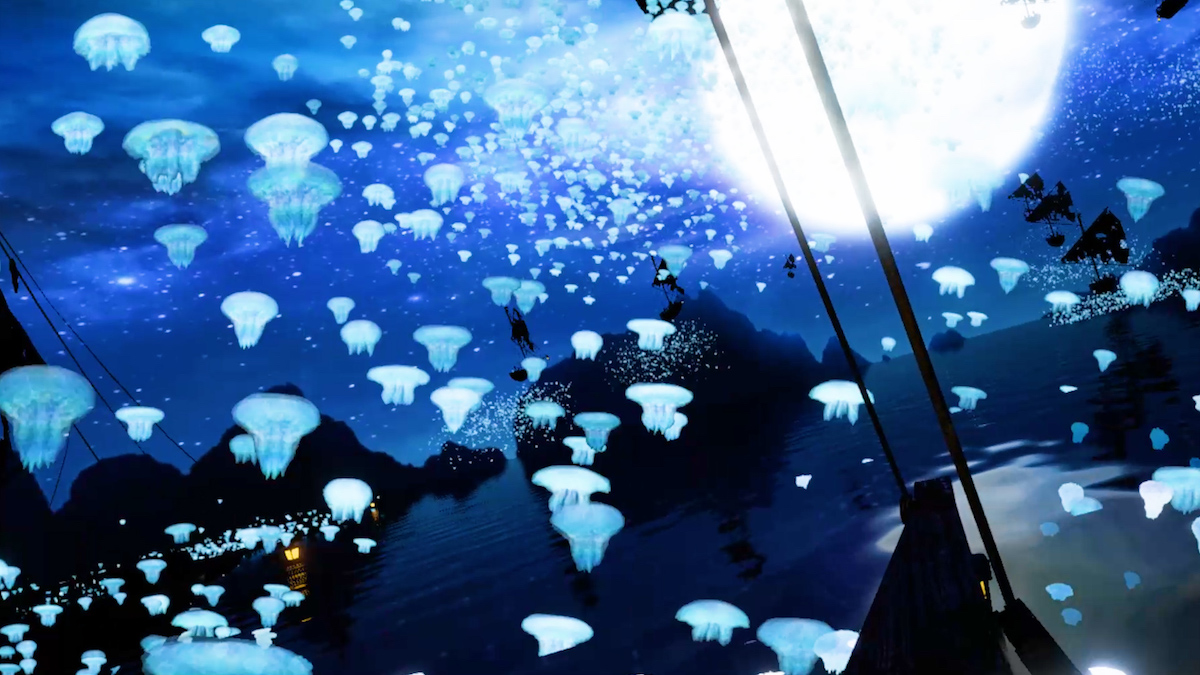 次は何がやってくるのかビクビクしていると、美しく夜空を舞うクラゲのような生き物の大群に遭遇。怖いだけでなく、幻想的で美しい光景も、ふんだんに味わうことができます。