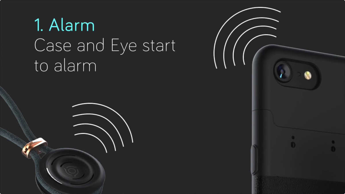 ケース本体と連動する専用アクセサリー「Eye」からiPhoneが離れると、100dBの大音量でアラートが鳴り響く。不意に盗難にあってもすぐに気づけるほか、持ち去られても自動的に画面がフリーズするため、 iPhoneの中身を見られる心配はなくなる。
