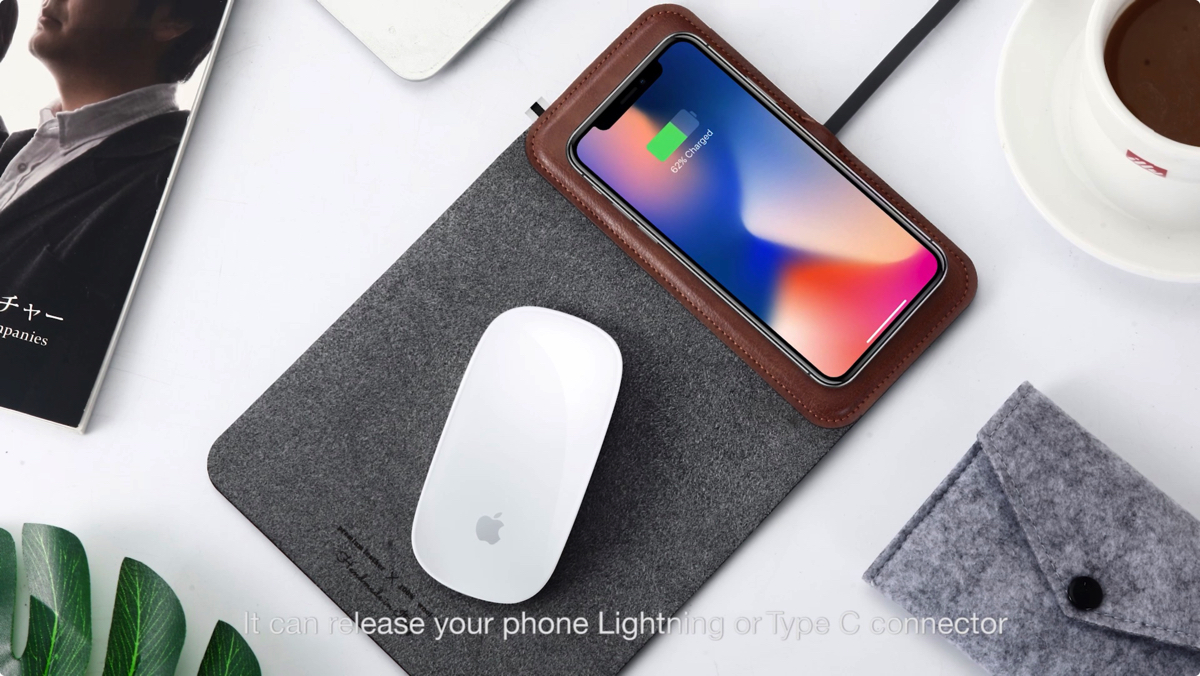 上部にワイヤレス充電器を備えたマウスパッド「MousePad+」。無線充電規格「Qi」に対応した端末なら、載せるだけでワイヤレス充電が可能だ。iPhone X、Galaxy S6 edge以降、Nexus 4以降などの端末が該当する。