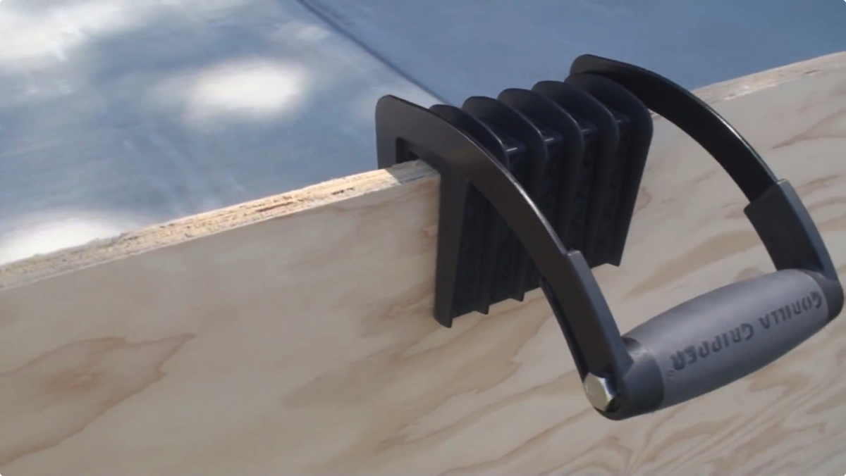 「Gorilla Gripper」の使い方は簡単で、板状の資材に挟んで持ち上げるだけ。パネルを挟む部分は滑りにくくなっており、グリップ部分もラバー加工で滑り落ちにくい設計だ。幅2cmまでの資材なら木材でも鉄板でも持ち上げられ、レビューによると70kgもの資材を一人で運搬できるようだ。