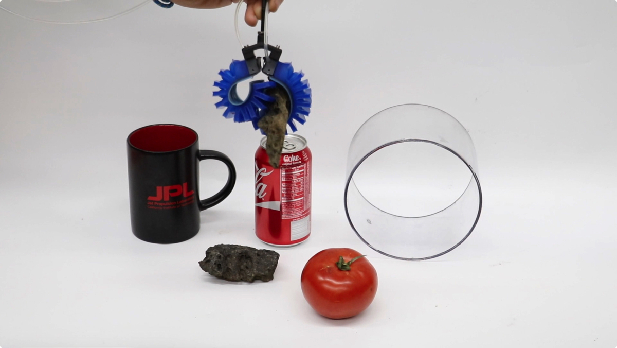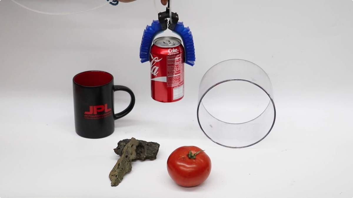 「Soft Robotic Gripper」がつるつるのガラス製の筒を挟み込むと、貼り付くように筒が持ち上がる。いびつな形の岩や丸いトマトも、持ち上げるものの形に応じて変形できるため、持ち上げるものを選ばないデザインとなっている。