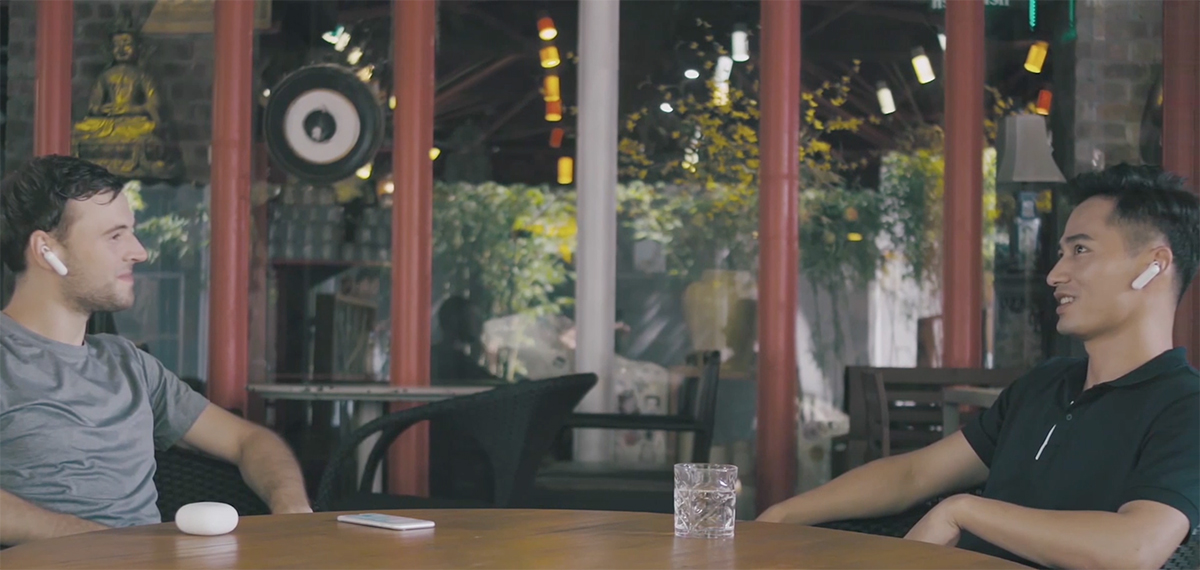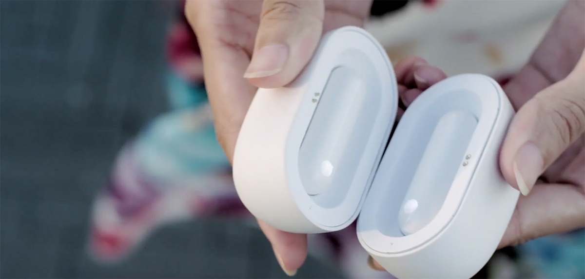 本体が2つセットで用意された「WT2」。会話する両者で耳に装着し、専用アプリとBluetooth接続するだけで、お互いの声を自動認識しほぼリアルタイムで翻訳ができる。