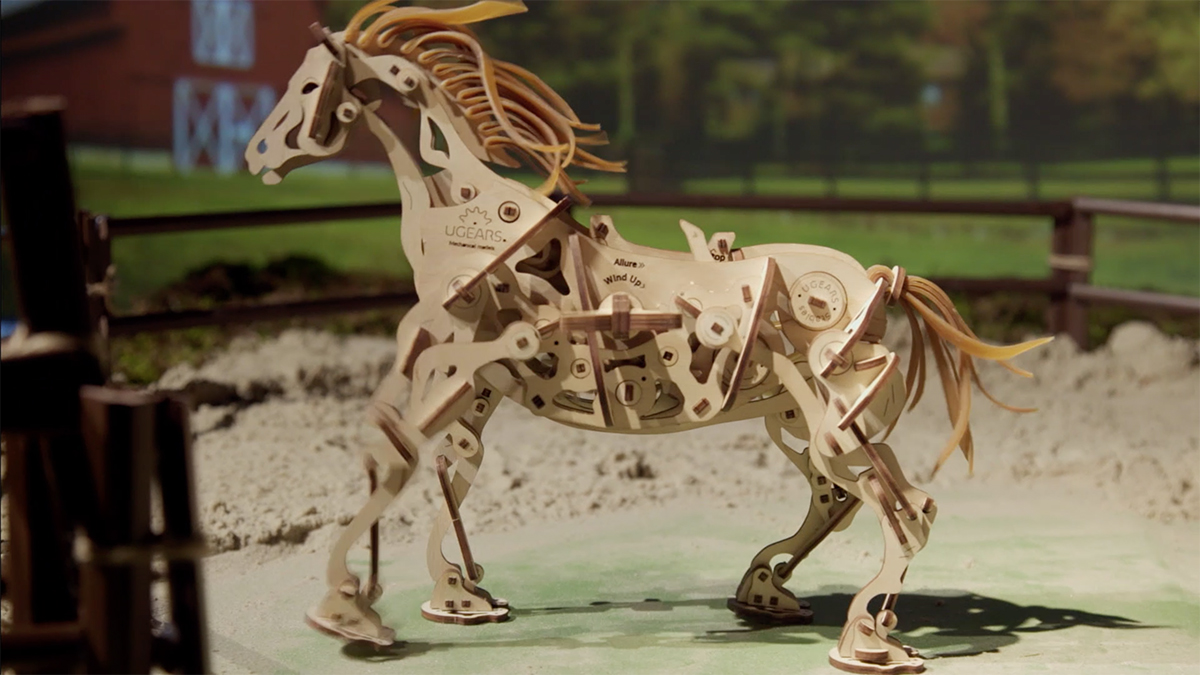 「UGEARS Horse-Mechanoid」は、躍動感あふれる馬のフォルムを細部まで精巧に再現しており、ゴムの動力のみで見事に歩かせることができる。