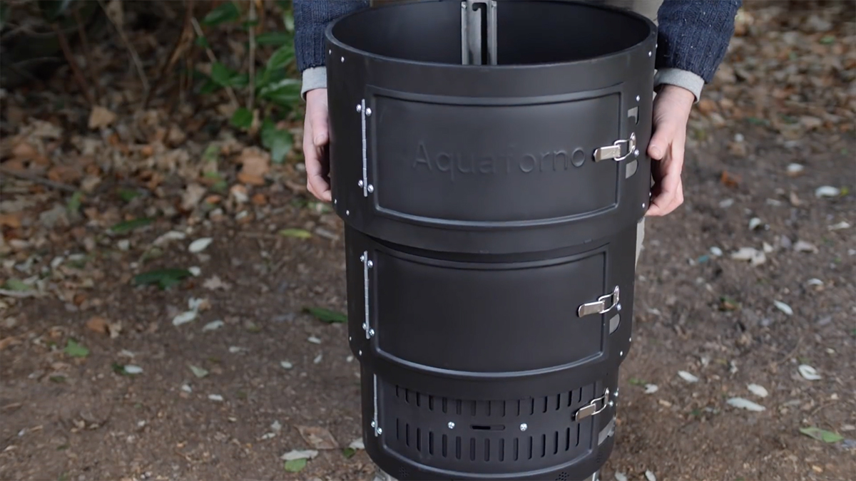 伸縮可能な入れ子式構造を採用した「Aquaforno II」は、折り畳んで持ち運び大型調理ストーブとして活用可能だ。