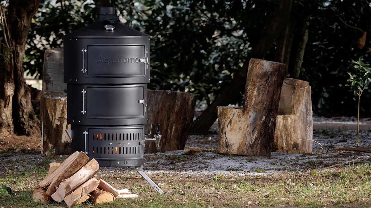 オールインワンの調理用ストーブ「Aquaforno II」。様々な調理方法に対応でき、給湯機や暖房用途としても活用できる万能アウトドアアイテムだ。