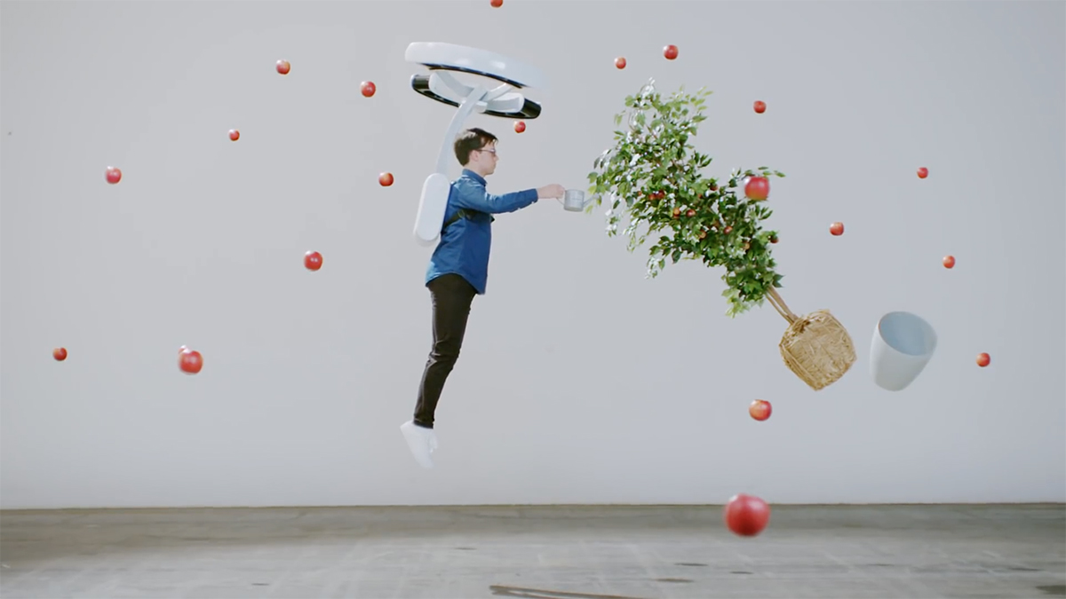 「Lunavity」は、バックパックのように背負って装着するデザインで、本体上部に円周上に配置された16個のローターにより装着者の動作に合わせて浮遊力を発生させる仕組みだ。