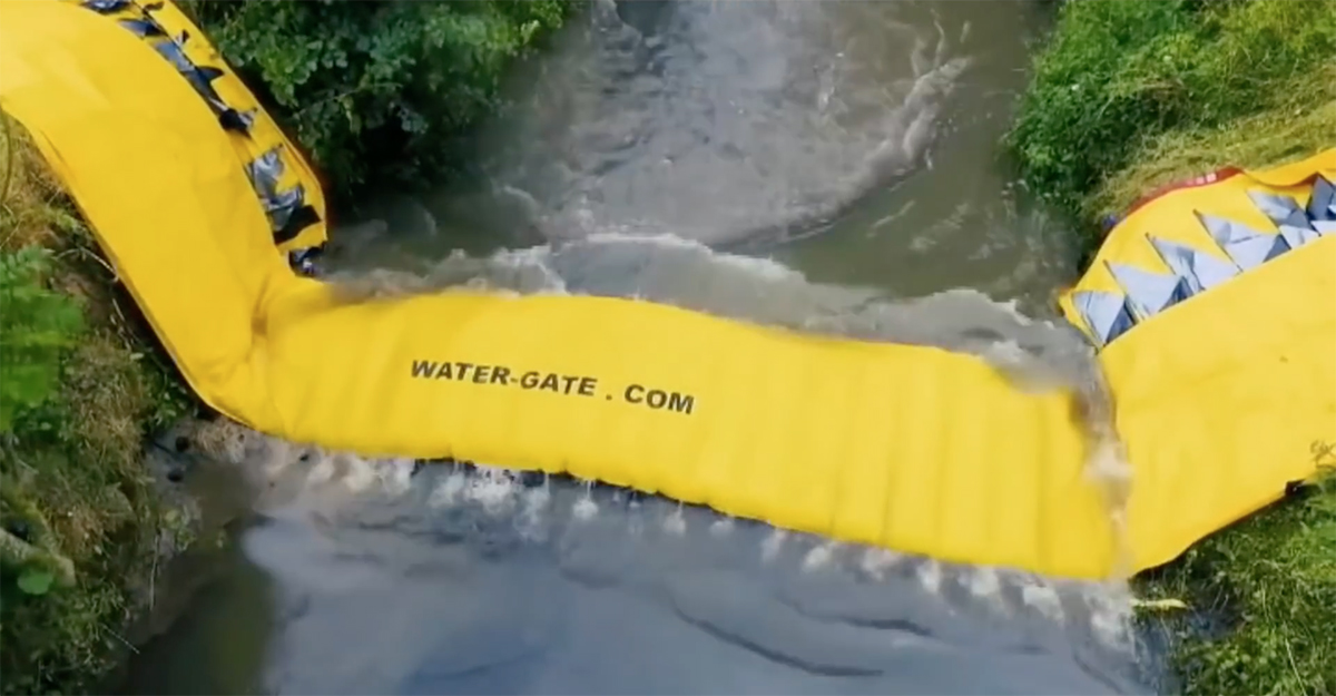 川などを縦断するように広げてわずか数分で設置可能な「Water-Gate」。水が内部に流れ込むことによって自動で膨らむ仕組みだ。
