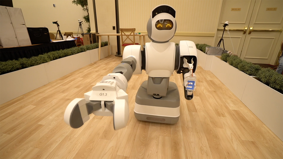 本体下部の車輪で自由に移動が可能で、両腕のロボットアームで自在に道具を扱うことができる「Aeolus Robot」。高性能カメラで家の中の様子を正確に把握しながら日常生活を様々にサポート可能だ。