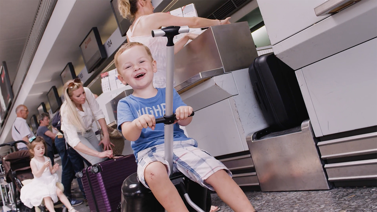 本体の上部に子供が座れるシートを搭載した「Micro Lazy Luggage」は、ハンドルと補助輪をサッと引き出すだけで、簡易ベビーカーとして子供と一緒に快適に移動できる。