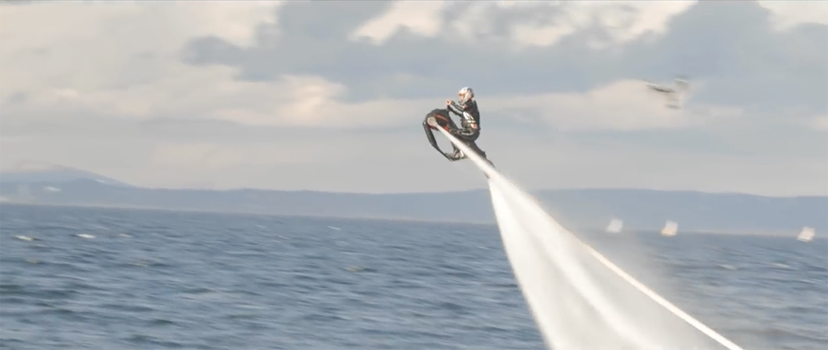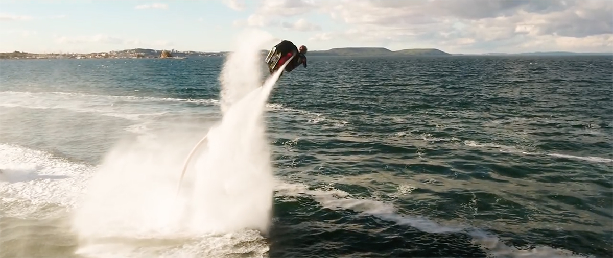 独自の飛行制御システムを搭載した「Flyride」は、船体からジェット噴射のように水を吹き出すことで、アクロバティックに宙を舞うことが可能だ。