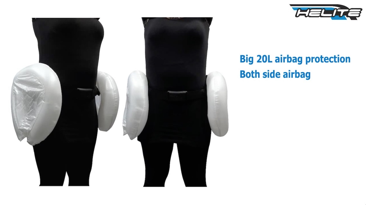 Heliteはバイク用のジャケットだけでなく、スキー用や乗馬用、それにちょっと変わった応用分野として介護用としても製品を提供している。内蔵したセンサーで転倒を感知すると、腰部分に巻きつけたエアバッグが膨らんで怪我を防ぐというプロダクトだ。