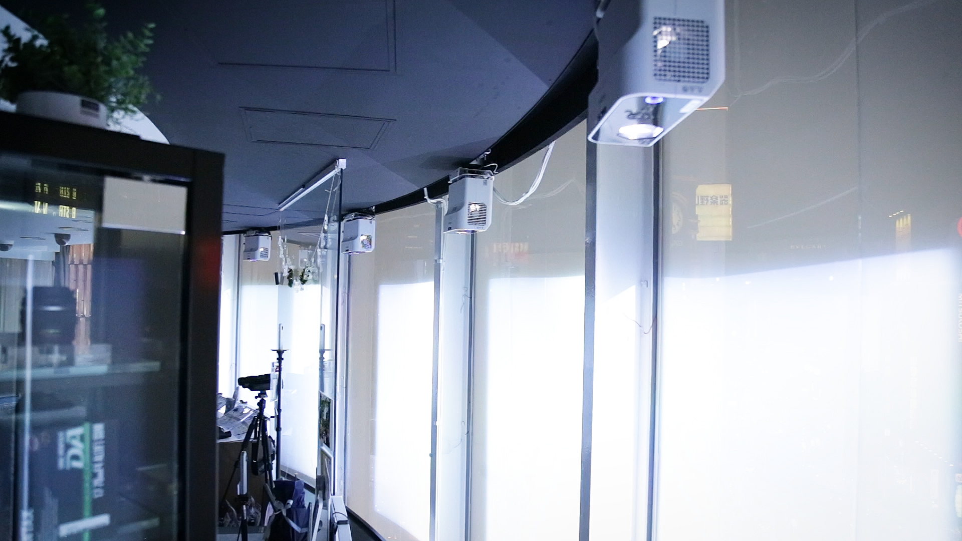 三愛ドリームセンターでは、40枚の窓の内側上下に、RICOHが製作した超短焦点プロジェクターを設置。計80台の超短焦点プロジェクターにより再結合された大型の映像が、窓一面に映し出されていく。