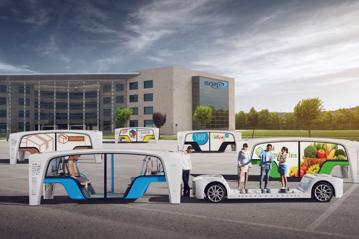 4人乗りの自動運転車「Rinspeed Snap」は、各種センサーや乗客向けのプラットフォームを搭載した「pod」と、巨大なスケートボードのようになる「skateboard」の2つに分離することが可能だ。