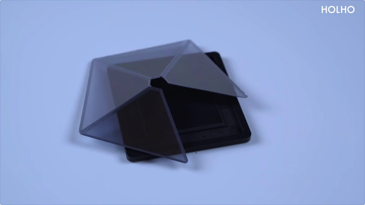 スマホやタブレットの上に置いて使用するピラミッド型のデバイス。ホログラム用動画の映像が、4面のガラススクリーンの中心に浮かぶように立体的に投影され、360°どこからでも見ることが可能だ。