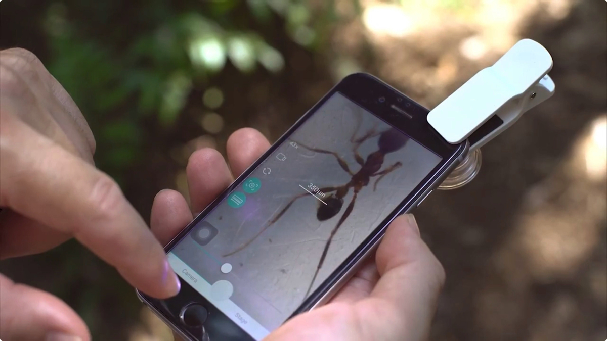 ほとんどの人が持ち歩くようになったスマートフォン。「μHandy」は、スマホのカメラ部分に挟んで装着するだけで、たちまちスマホが立派な顕微鏡に大変身する。