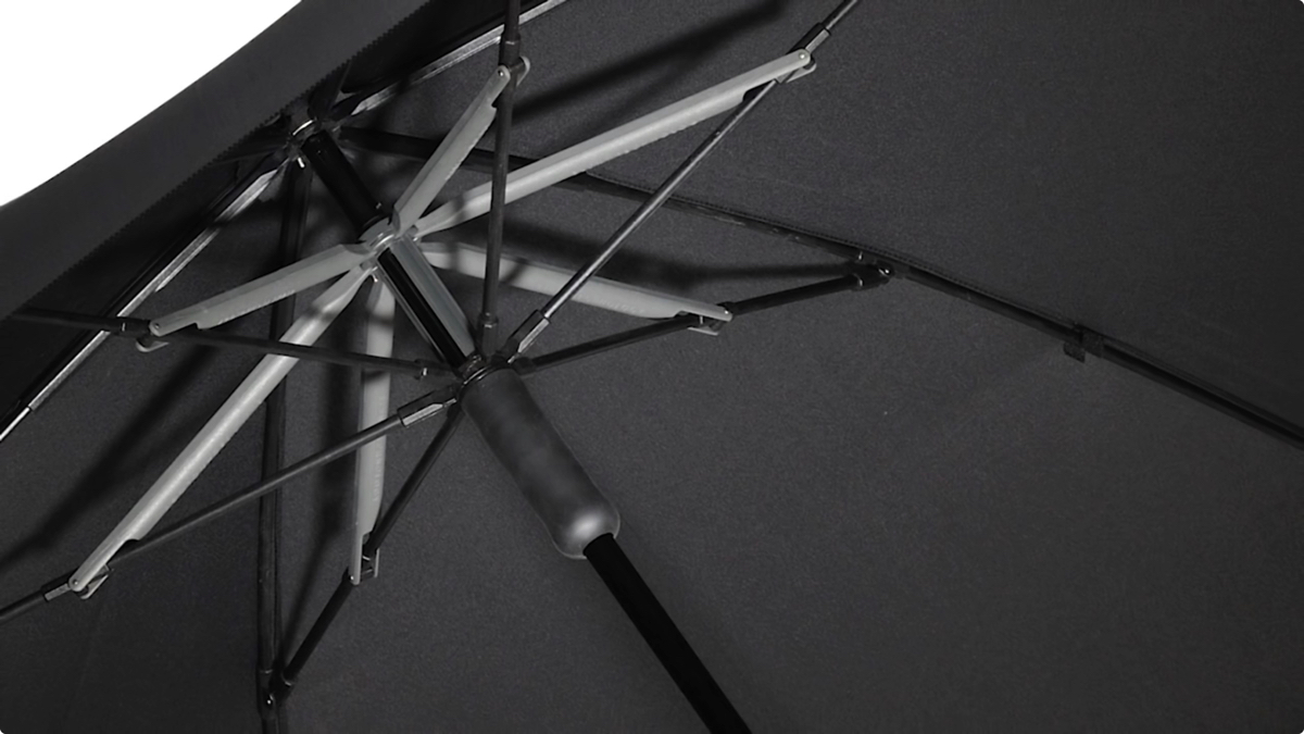 その秘密は強力な生地の強度にある。「BLUNT」の傘は、独自の開発技術である放射張力システムを採用しており、傘が開く時の動力を強い生地全体に分散する。その結果、空気力学的に傘の生地がピンと張り、強風でも裏返ることのない強力な傘になるという。