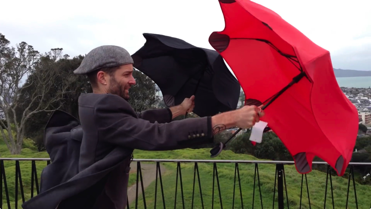 「BLUNT」のデザイナー であるグレイグ・ブレブナ-氏は、従来の傘を根本的に設計し直し、「BLUNTアンブレラ」の試作品を完成させた。その試作品第1号は、耐風実験で風速117kmもの強風に耐えきったという。