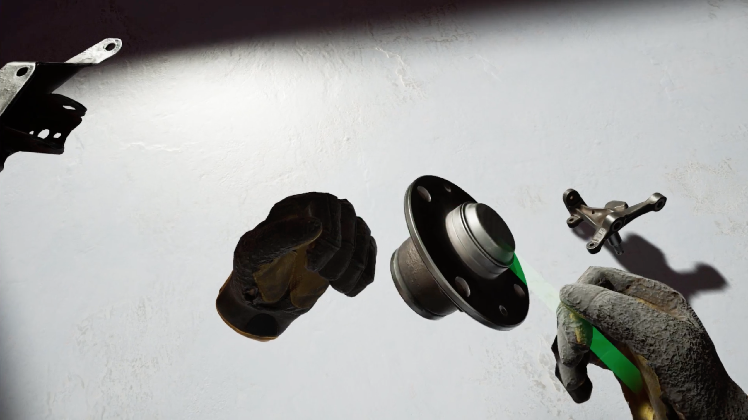 VR空間で一から車を組み立てるパズルゲーム「Wrench」。車庫のような空間にネジやベアリングなどバラバラの細かいパーツが散らばっており、一つずつ自分の手で組み立てていく体験が味わえる。