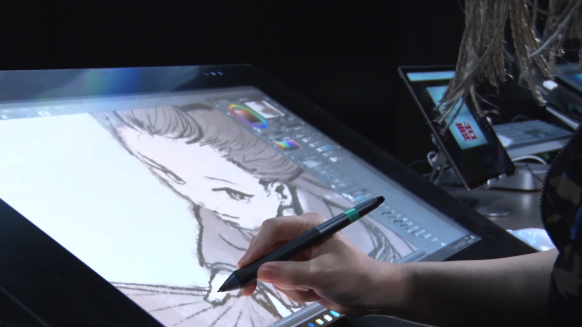 ステージ上にはワコムの液晶タブレットが1台ずつ設置されており、制作アプリは好きな物を使用可能だ。制作過程は大型モニターに映し出され、観客はリアルタイムで作品が完成していく様子を眺められるようになっている。