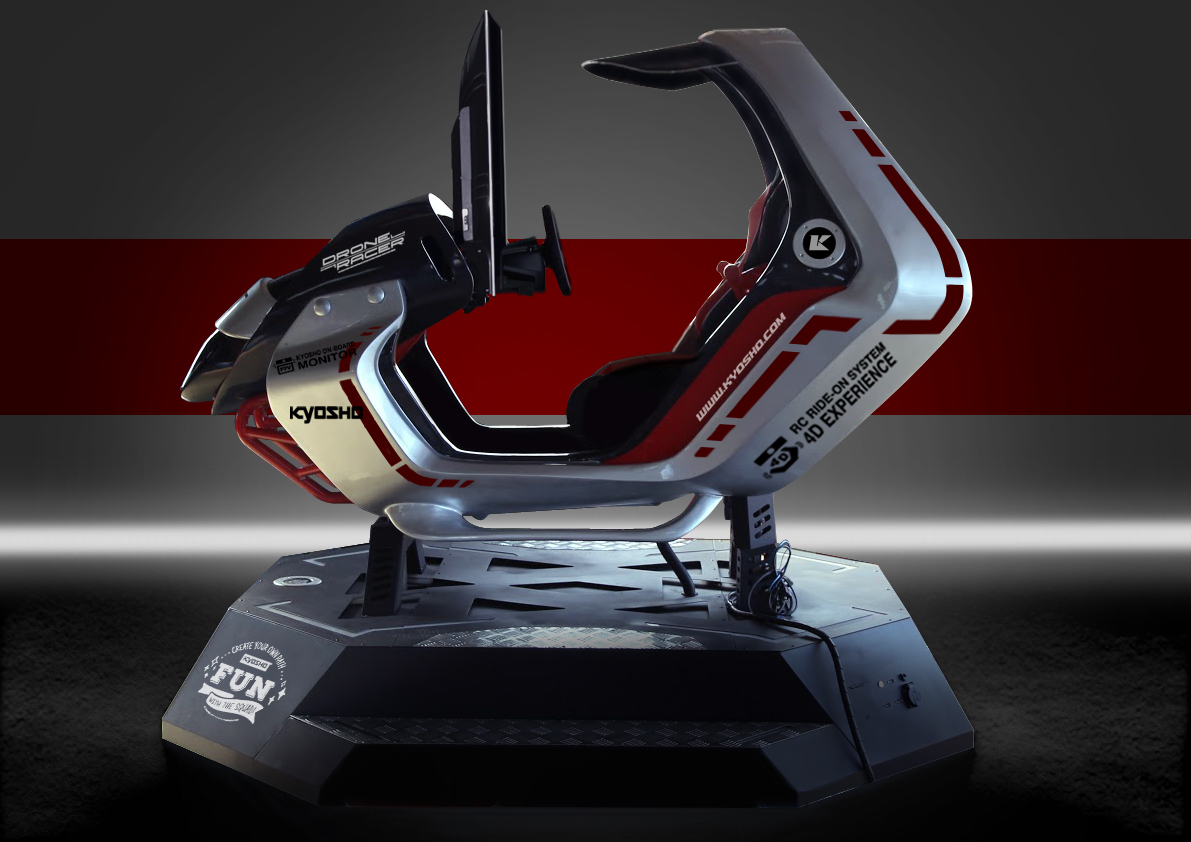京商株式会社が発表した「KYOSHO RC RIDE-ON SYSTEM 4D EXPERIENCE」は、「KYOSHOオンボードモニター」とラジコンやドローンに搭載したカメラユニットとの融合により実現した新しい操縦体感マシンだ。